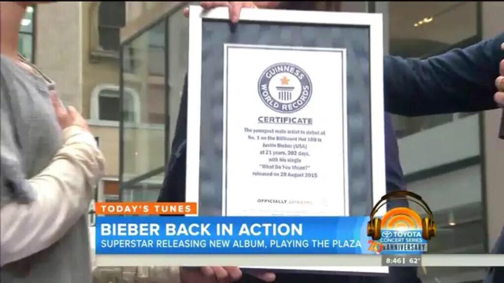 Durante la trasmissione mattutina, in cui Justin ha mostrato un nuovo look biondo platino, gli è stata consegnata una targa dei Guinness World Records per essere il più giovane artista maschile ad aver debuttato alla #1 della hot 100.